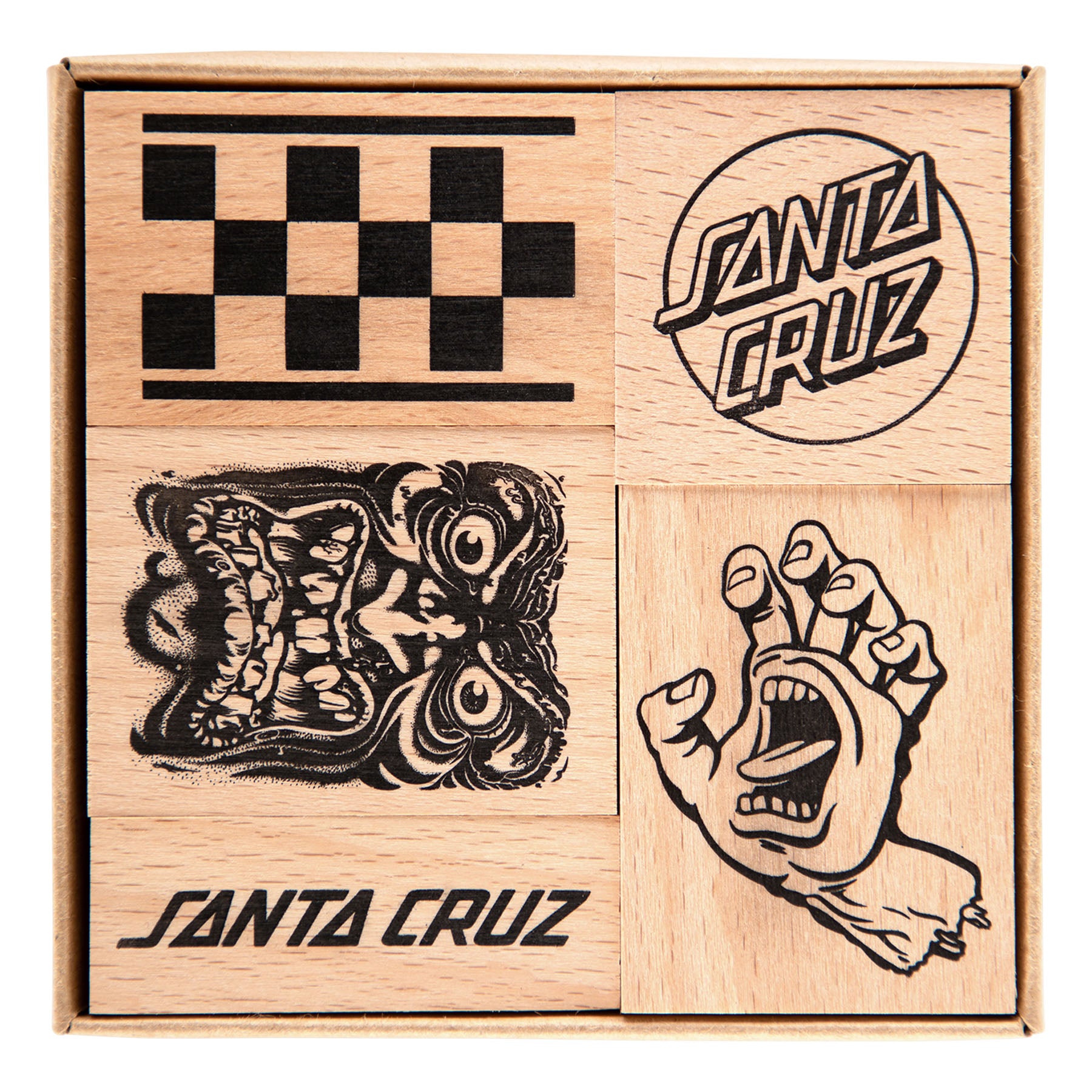 The Santa Cruz SC'26 wooden stamp set features 5 different stamps with classic Santa Cruz artwork: